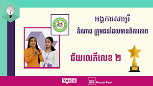 ソーシャルメディアの共有を通じて、サオリはプノンペンのImapct Hubが主催し、多数のNGOや非公式団体の参加を得てVoice Cambodiaが支援する「Now-Us Award」に出場しました。カンボジアで10名が応募、面接、3週間のトレーニング、厳しい競争を経て2位を獲得し、賞金15,000ドル(1万5千米ドル)を獲得し、プロジェクトを実施します。「ジェンダー平等と障害のある女性の能力促進」と名付けられたこのプロジェクトは、コンポンチュナン州のSAORIで実施されます。ジェンダー平等は、公平な開発を促進する上で重要な要素であり続けています。ジェンダーの分野で障害のある女性を支援します。