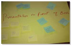 その次に、カシフさんは「アクセシビリティ」と聞いて何が思い浮かぶか、8個の言葉をポストイットに書くように言いました。そしてそれを2つのグループに分け、4つの言葉を作りました。最終的には、4人の参加者が、組み合わせを色々と考え、最終的な4つの言葉を見つけることができました。このアクティビティは現実的なマナーの中、お互いに議論し考える機会を与えました。