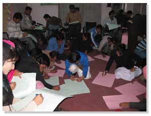 このアクティビティでは、2つのグループに分かれてラホールとカラチの地図を制作することも行いました。この地図は街の有名な歴史的場所の位置も含み、他のグループが違う場所に案内をしてくれる前に、自分達の地図を提示する必要がありました。このアクティビティの目的は、自分達が活動をする街を知ることの大切さを参加者に理解してもらうことでした。