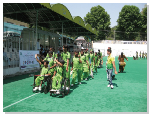 開会式はIqbal Khan Hockey スタジアムで行われました。参加者はの乳状進が行われ、ゲスト代表が各チームの紹介をしました。チーム毎に異なる色のユニフォームを着て、とても魅力的でした。行進の後、主賓で国会議員のDr. Azhar Jadoon氏が挨拶をしました。参加者への歓迎と、試合の健闘を讃えました。スポーツは障害者にとって重要なものだが、楽しむ機会は不足しているので、我々はそれを提供しなくてはならないと述べ、更に、障害者にアクセシブルなスタジアムを建設することを約束しました。